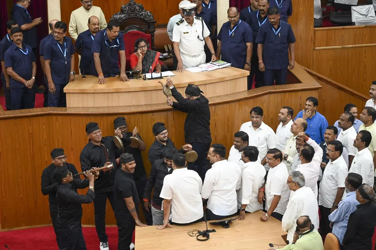 21 मार्च, 2025 को ओडिशा विधानसभा में महिलाओं की सुरक्षा के मुद्दे पर एक विरोध के दौरान कांग्रेस विधायक काले खेल संगीत वाद्ययंत्रों में कपड़े पहने। फोटो क्रेडिट: पीटीआई