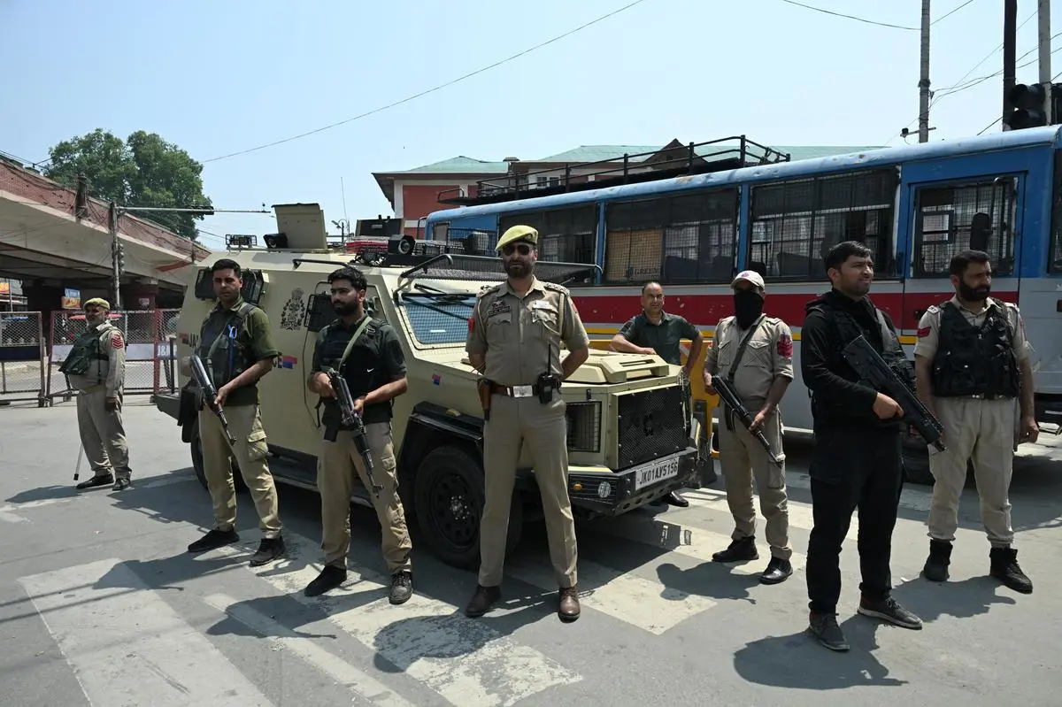 1 मई, 2025 को श्रीनगर में एक आश्चर्यजनक खोज ऑपरेशन के दौरान एक अस्थायी चेकपॉइंट पर जम्मू और कश्मीर पुलिसकर्मी स्टैंड गार्ड। फोटो क्रेडिट: इमरान निसार