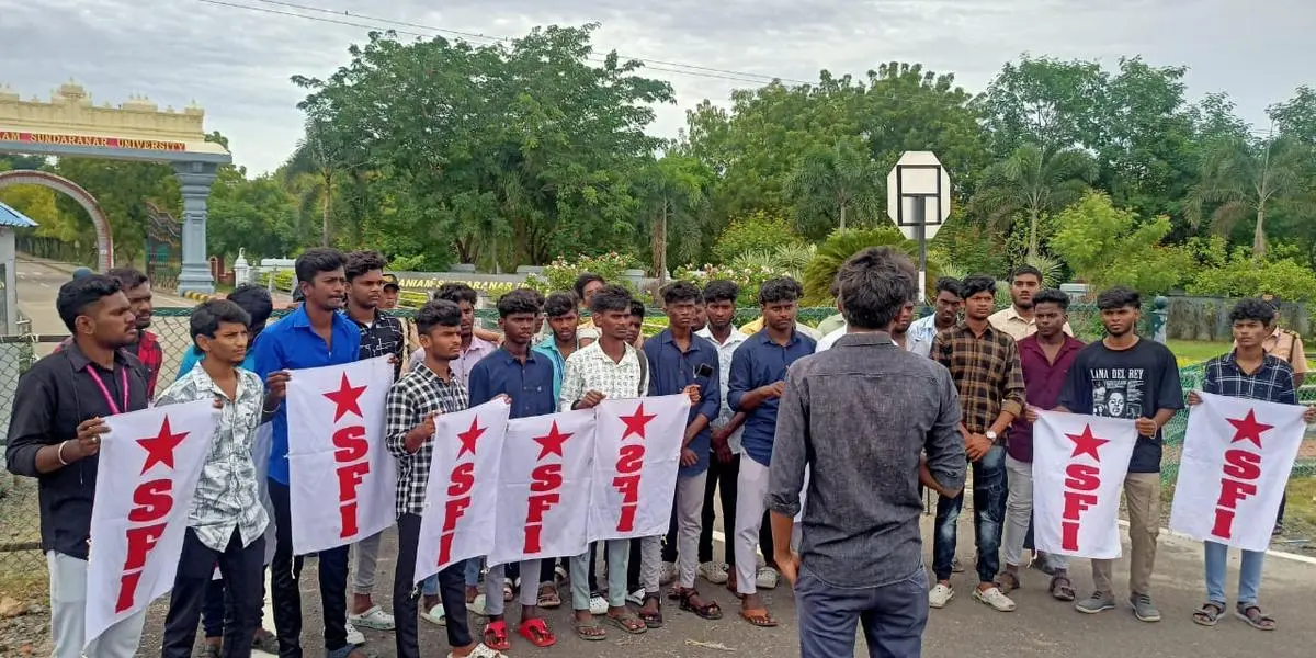 स्टूडेंट्स फेडरेशन ऑफ इंडिया (सीपीआईएम का छात्र संघ) के सदस्य कैंपस में सविता राजेश के नामांकन का विरोध कर रहे हैं। | फोटो साभार: विशेष व्यवस्था द्वारा