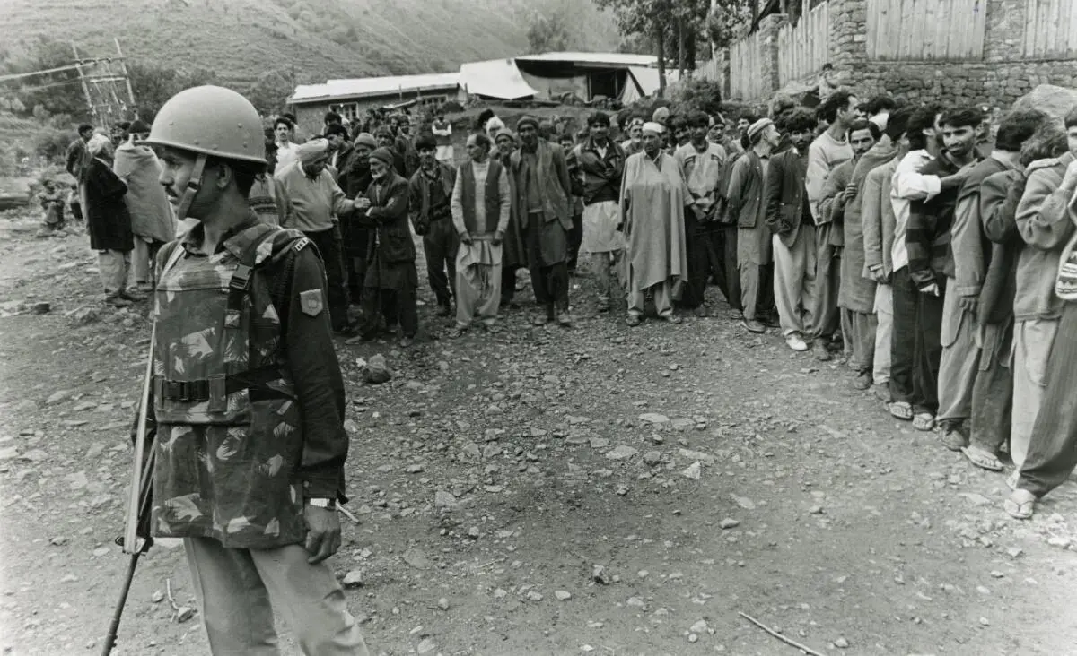 एक सुरक्षा जवान 23 मई, 1996 को बारामुला निर्वाचन क्षेत्र में एक मतदान बूथ से पहले मतदाताओं के रूप में सतर्कता रखता है फोटो क्रेडिट: हिंदू अभिलेखागार