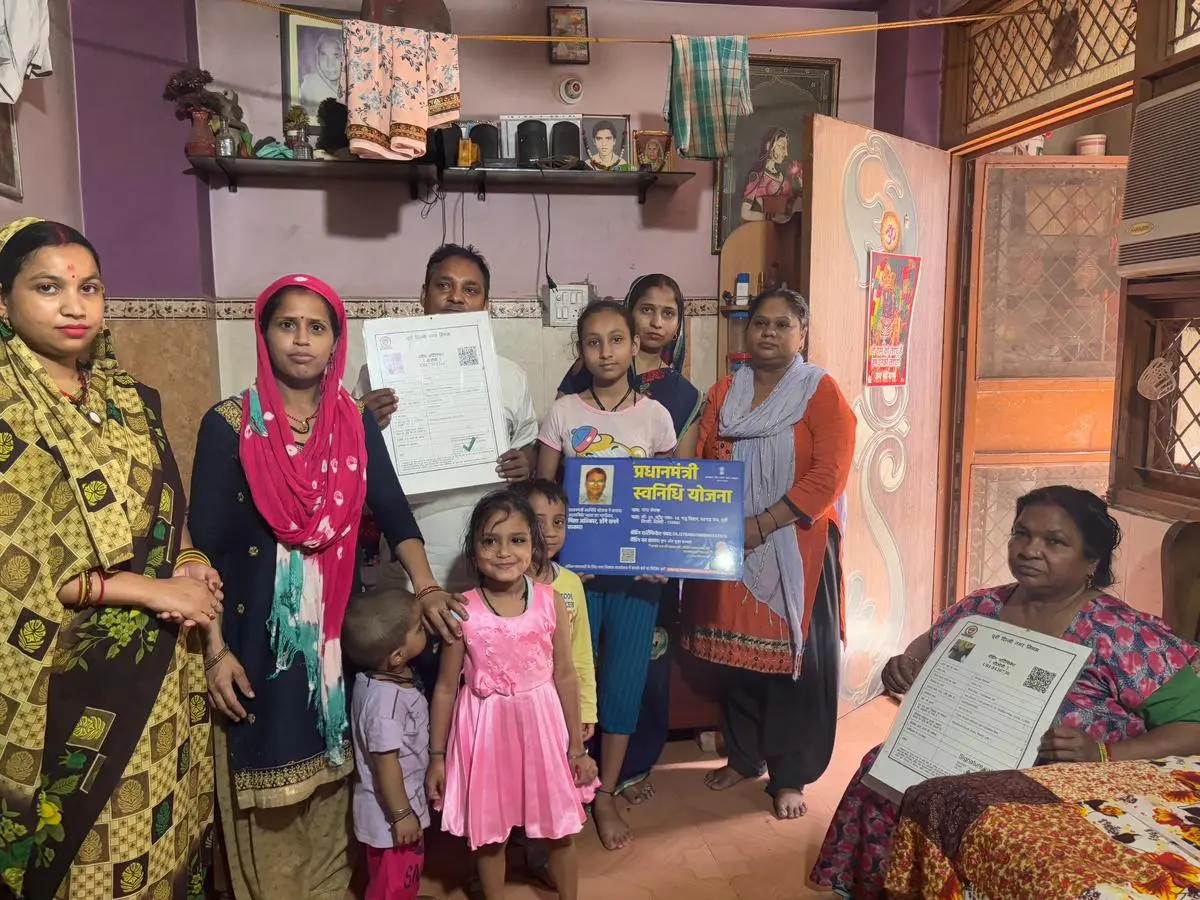 शिव कुमारी ने अपने घर पर अपने परिवार के साथ, अपने पीएम सान्विदी कार्ड और वेंडिंग के प्रमाण पत्र को प्रदर्शित किया – जो एक सड़क विक्रेता के रूप में आजीविका के अधिकार की पुष्टि करते हैं। | फोटो क्रेडिट: विटस्टा कौल