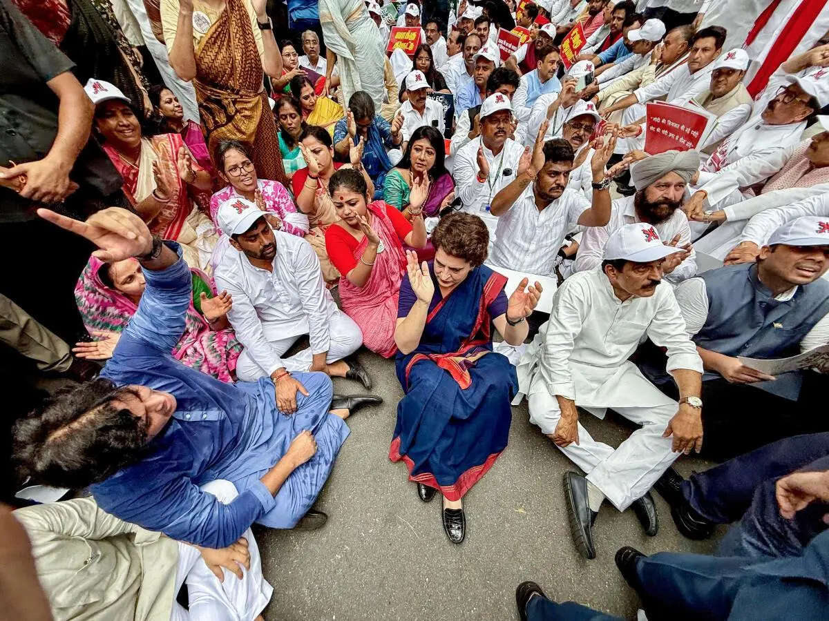 साथी प्रदर्शनकारियों के साथ प्रियंका गांधी वाडरा। सुकुमार सेन से लेकर अशोक लावासा तक, ईसीआई की विकसित भूमिका संवैधानिक अधिकार और राजनीतिक हस्तक्षेप के बीच तनाव को प्रकट करती है, चुनावी अखंडता के बारे में तत्काल सवाल उठाती है। | फोटो क्रेडिट: एनी
