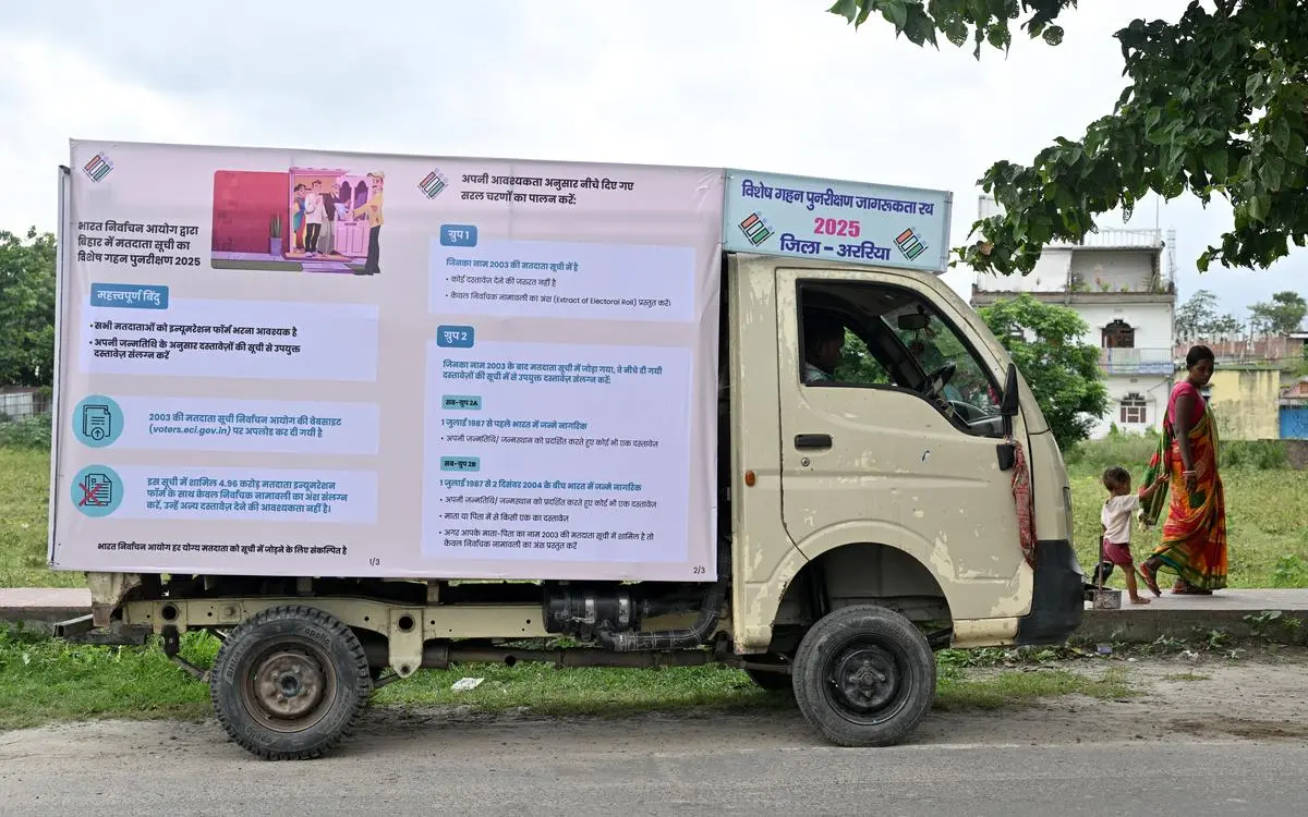 चुनावी रोल के लिए विशेष जांच संशोधन के लिए एक विज्ञापन वैन 09 जुलाई, 2025 को पूर्णिया, बिहार में देखा गया है फोटो क्रेडिट: शशी शेखर कश्यप