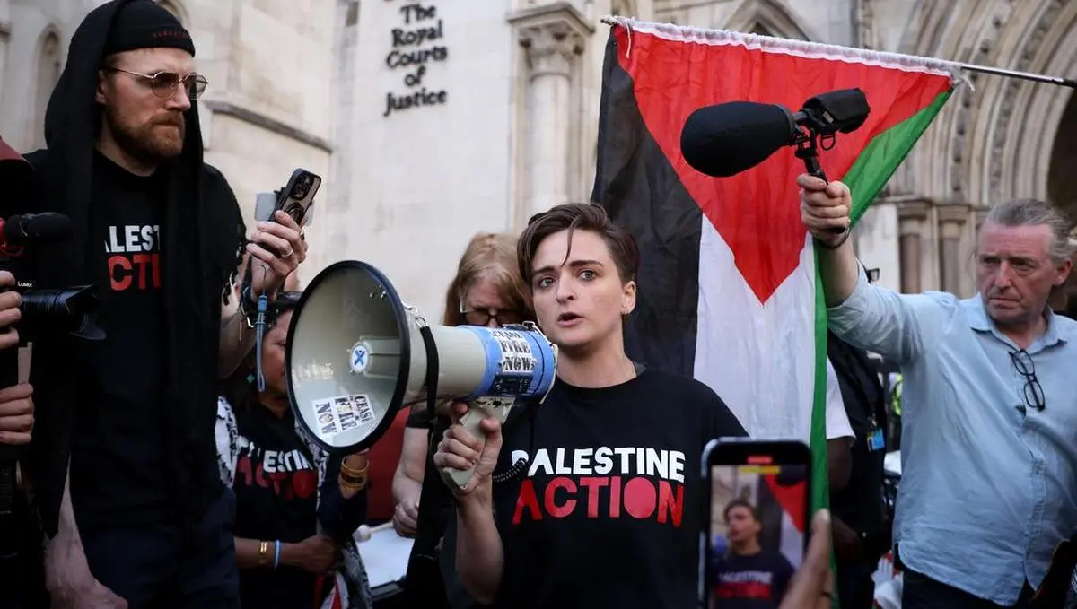 एक फिलिस्तीन एक्शन समर्थक लंदन में 4 जुलाई, 2025 को आतंकवाद विरोधी कानूनों के तहत समूह के अभियोगी को निलंबित करने के लिए एक कानूनी चुनौती के बाद शाही अदालतों के बाहर न्याय के बाहर एक मेगाफोन में बोलता है। | फोटो क्रेडिट: गेटी इमेजेज