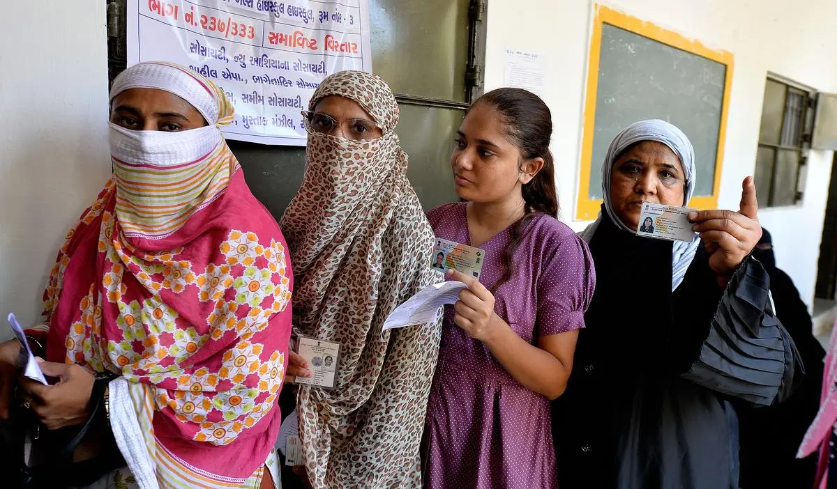 आम चुनाव के लिए 07 मई, 2024 को अहमदाबाद, गुजरात में वोट डालने के लिए मुस्लिम महिलाएं कतार में खड़ी हैं। | फोटो साभार: विजय सोनी