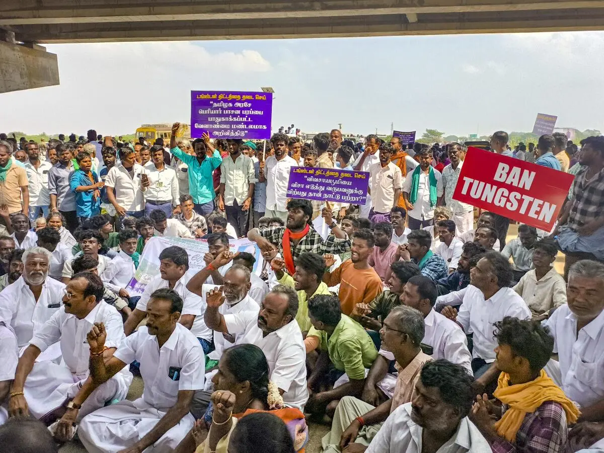 नागरिकों ने 7 जनवरी को मदुरै में मेलुर तालुक में टंगस्टन खनन परियोजना को रद्द करने की मांग करते हुए एक विरोध प्रदर्शन किया। फोटो क्रेडिट: पीटीआई