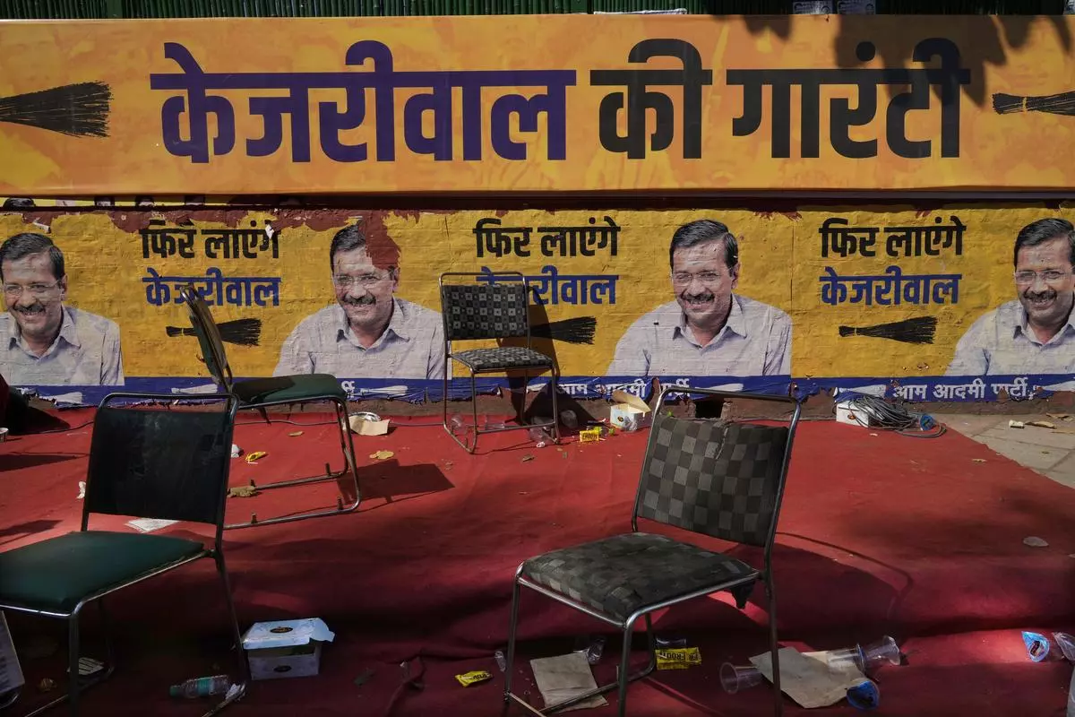 AAP का वोट शेयर इस बार 2020 में 2020 में 53.6 प्रतिशत से घटकर 43.57 प्रतिशत हो गया। यहाँ, AAP कार्यालय 8 फरवरी को नई दिल्ली में एक निर्जन रूप पहनता है फोटो क्रेडिट: मनीष स्वारुप/एपी