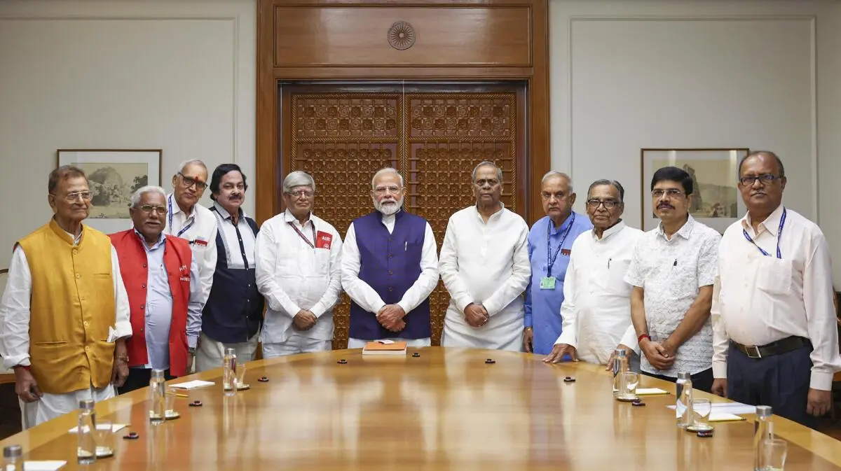 प्रधान मंत्री नरेंद्र मोदी 24 अगस्त को नई दिल्ली में अपने आवास पर केंद्र सरकार के कर्मचारियों के लिए संयुक्त सलाहकार मशीनरी के एक प्रतिनिधिमंडल से मुलाकात करते हैं। फोटो साभार: पीटीआई